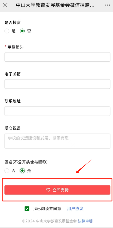 ③填写信息后,点击“立即支持”。带*号为必填项目。可选择是否匿名。