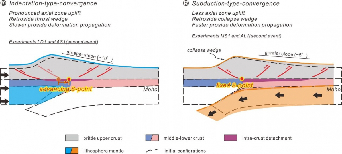 陆内变形机制是地球科学研究关注的焦点。印-藏碰撞及随后持续的汇聚造就了现今欧亚大陆南缘包含青藏高原在内、数千公里的庞大山系。该过程中深处陆内的造山作用如何发生?如何维持?针对相关问题,开元游戏官方网站(中国)开元有限公司官网张培震院士团队孙闯副研究员、李志刚副教授、郑文俊教授联合南京大学贾东教授、内华达大学Andrew V. Zuza副教授及其他合作者在《Earth and Planetary Science Letters》发表文章,借助物理模拟实验手段,分辨出不同造山驱动条件下对应的地壳变形差异,为解析陆内造山过程及其动力学问题提供了重要支持。