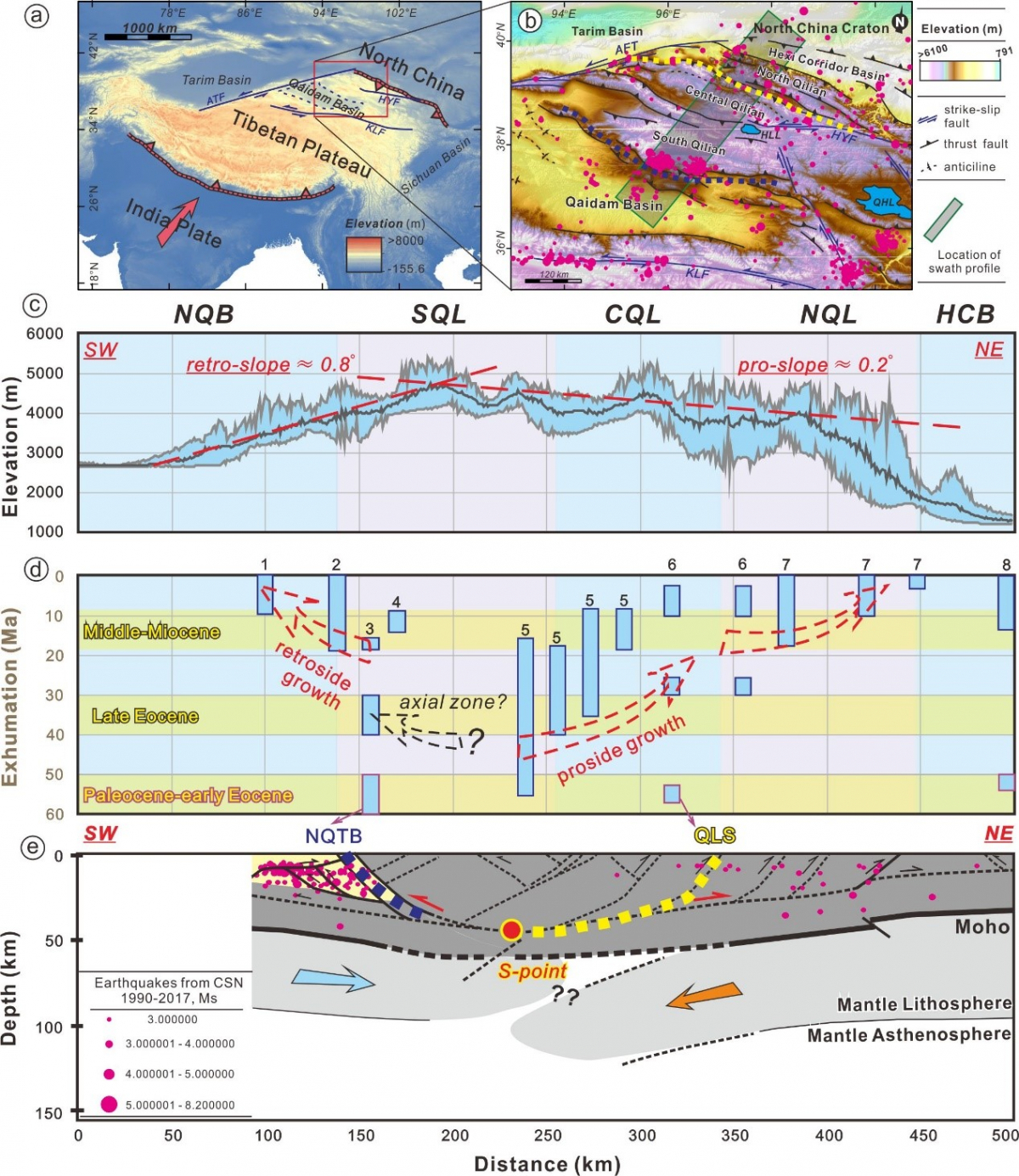 图3(a 和b)青藏高原东北缘祁连山地区区域构造位置、(c)地形、(d)剥露时序及(e)深部结构和现今地震分布特征