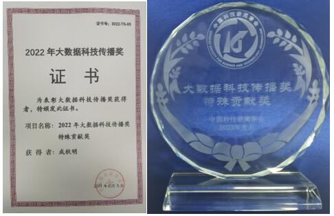 鉴于成秋明院士在我国科技领域、科技成果转换中的杰出贡献,以及在国内外大数据与科技传播领域中的重要影响和作用,受本届评委会审慎推荐和严格评审审定,其获得“2022大数据科技传播—特殊贡献奖”。据悉,本次还评审出作品奖9项,团体奖13项,个人奖28名。
