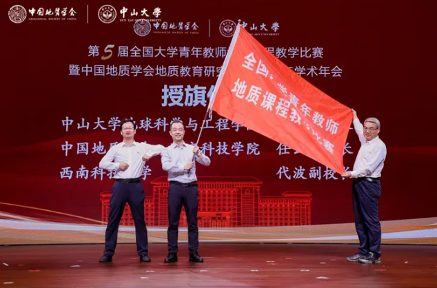 最后,西南科技大学副校长代波接过大赛旗帜,并盛情邀请青年教师们参与2027年于西南科技大学举办的第六届全国大学青年教师地质课程教学比赛。