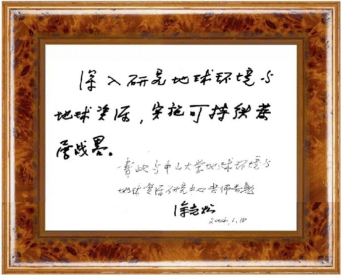 成立之初,中国科学院地球科学部原主任、著名地球科学家涂光炽院士就对中心寄予殷切期望,亲笔题写“深入研究地球环境与地球资源,实施可持续发展战略。”予以勉励。